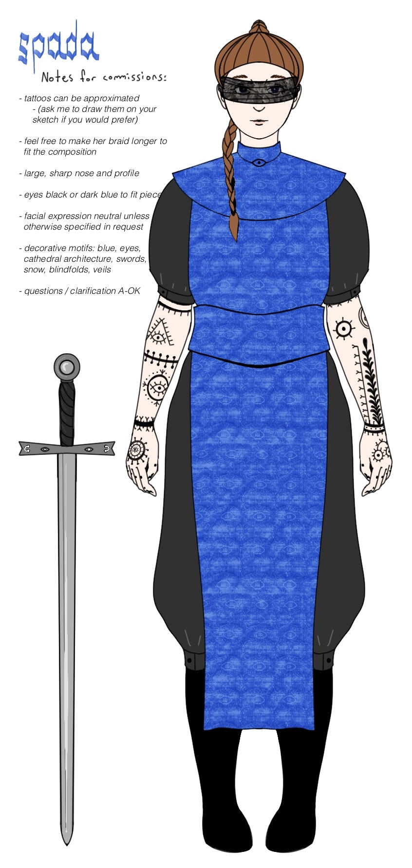 An open eye is the iconography of her religion that is definitely not Catholicism with the serial numbers filed off.Her tattoos are sicanje and you don't need to be too fussed about perfect placement accuracy (even I change it a bit from drawing to drawing, usually.)As is implied from the LARP information on the homepage, Spada's personality (such as it can be called a personality) is one of devotion and perfect adherence to doctrine.